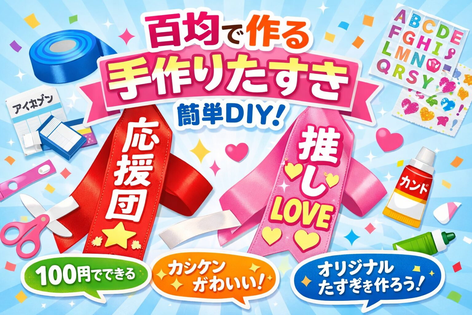 「運動会で目立ちたい!」「推し活で注目されたい!」「家族を驚かせたい!」そんなときにピッタリなのが“たすき”です。でも、既製品は高いし、好みのデザインが見つからない…。そんな悩みを解決してくれるのが、百均アイテムで作る手作りたすき!この記事では、ダイソー・セリア・キャンドゥなどで手に入る材料だけを使って、オリジナルたすきを作る方法をわかりやすく解説します。中学生でも簡単にできるので、ぜひ一緒に作ってみましょう!